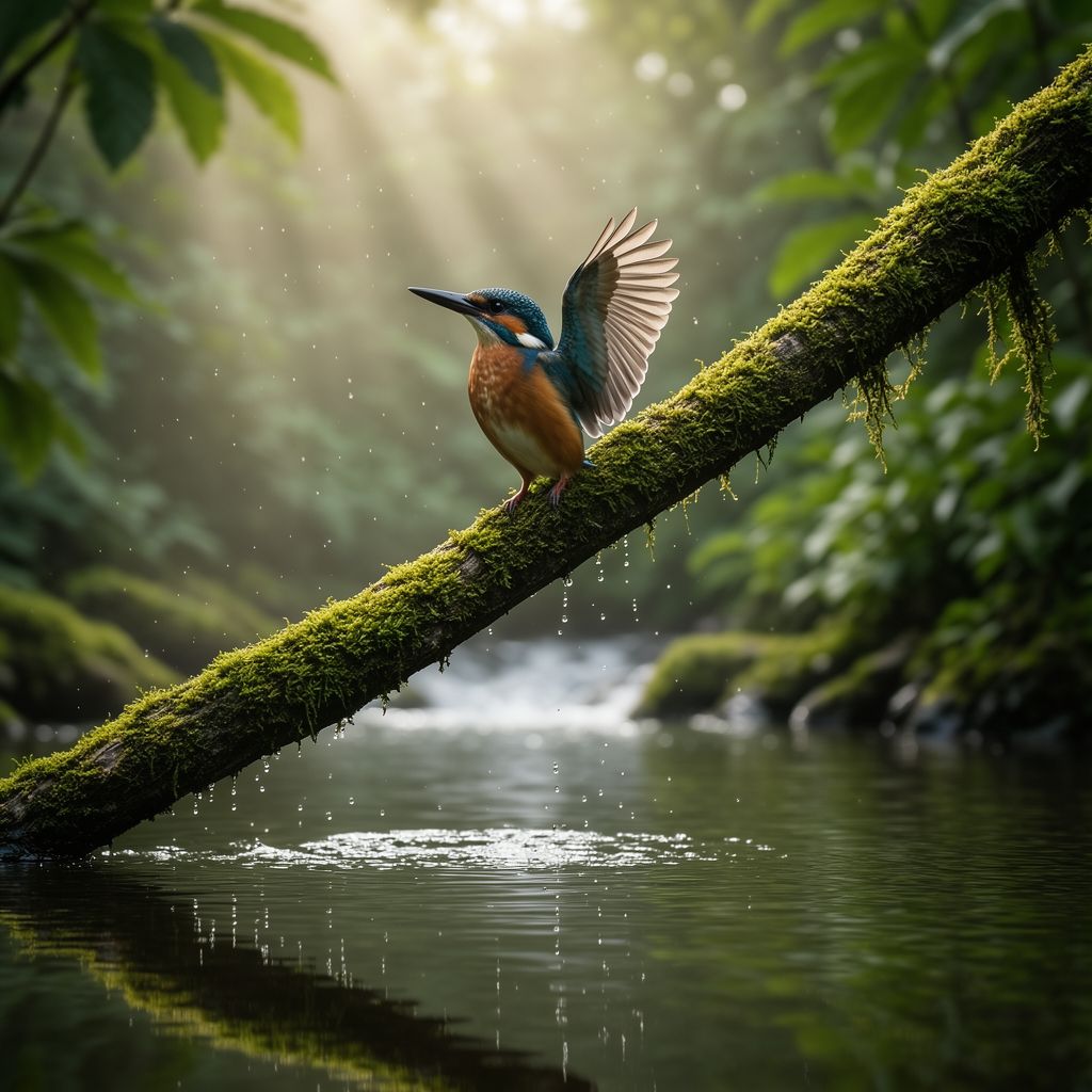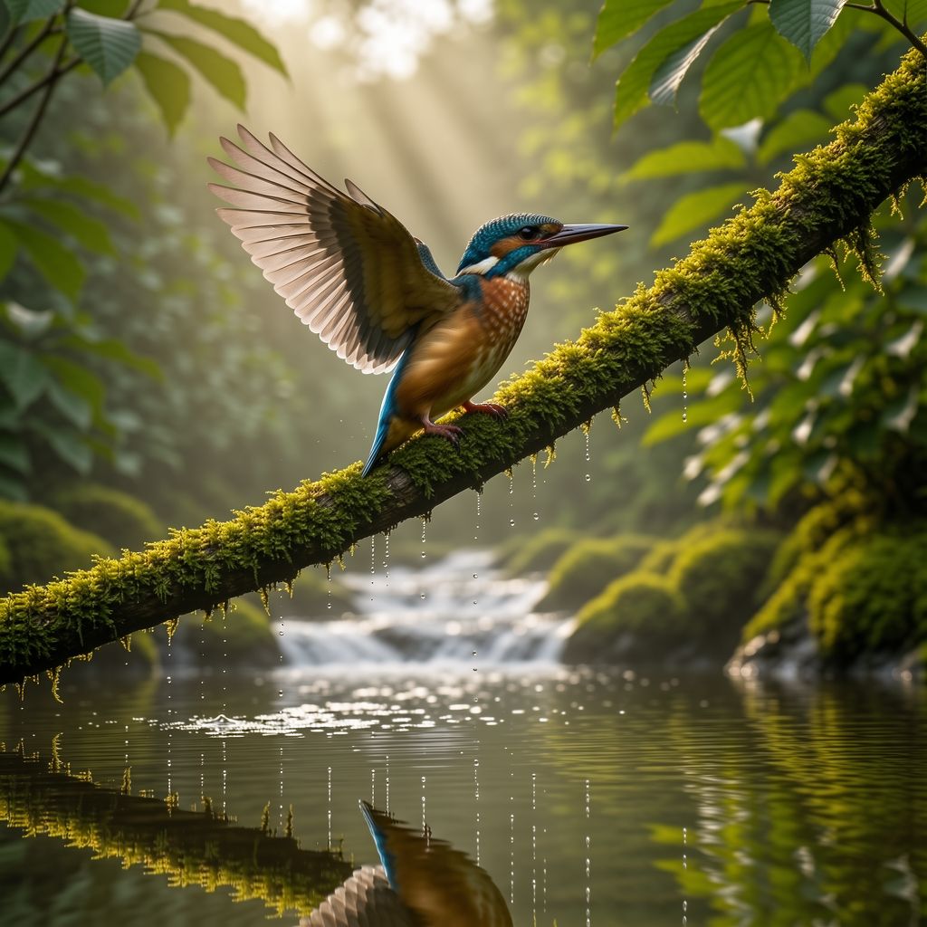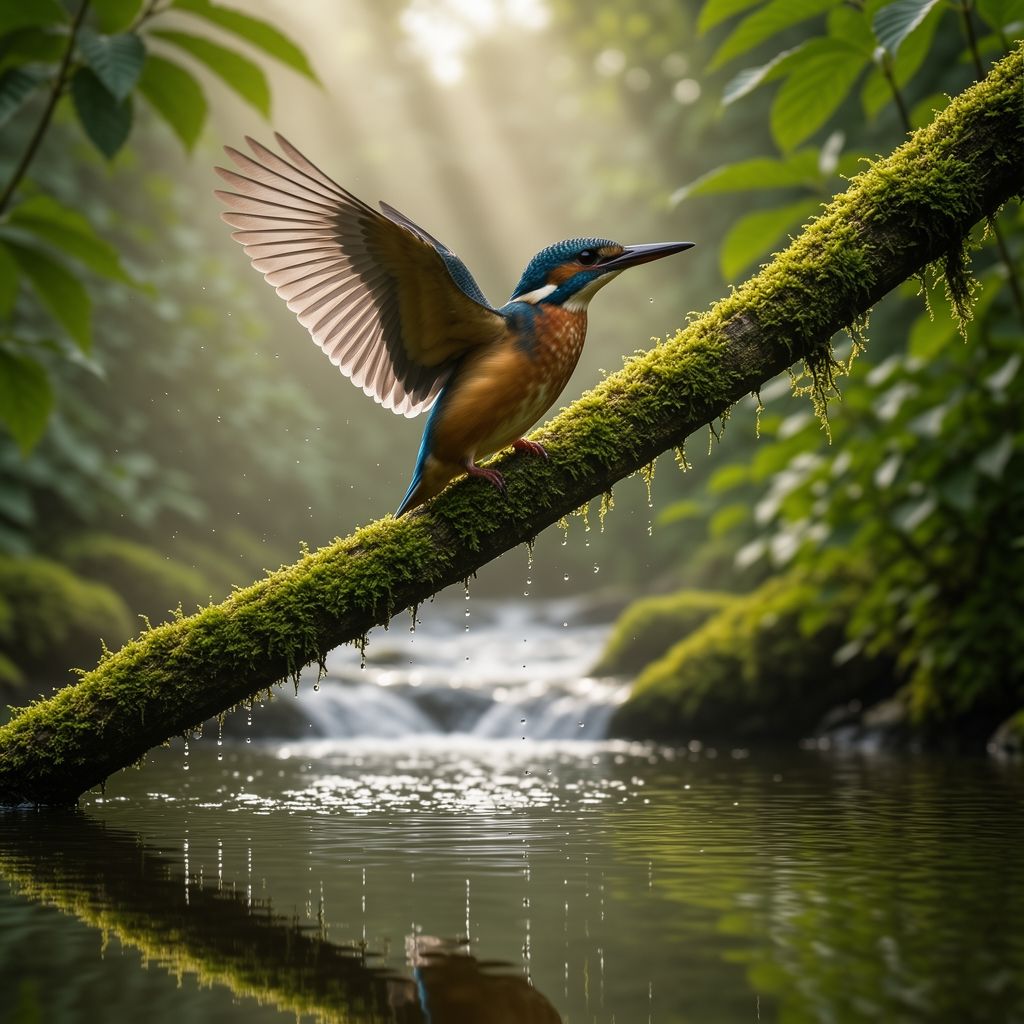 A majestic kingfisher perched on a moss-covered tree branch above a flowing forest stream, wings slightly open, droplets of water frozen in midair, early morning mist, soft volumetric sunlight rays filtering through dense green leaves, clear reflection in the water surface, ultra detailed iridescent feathers with blue and orange tones, macro photography, 200mm telephoto lens, shallow depth of field, professional wildlife photography, high dynamic range.
