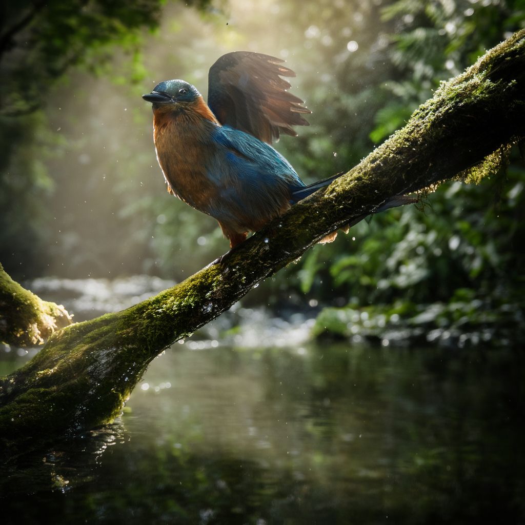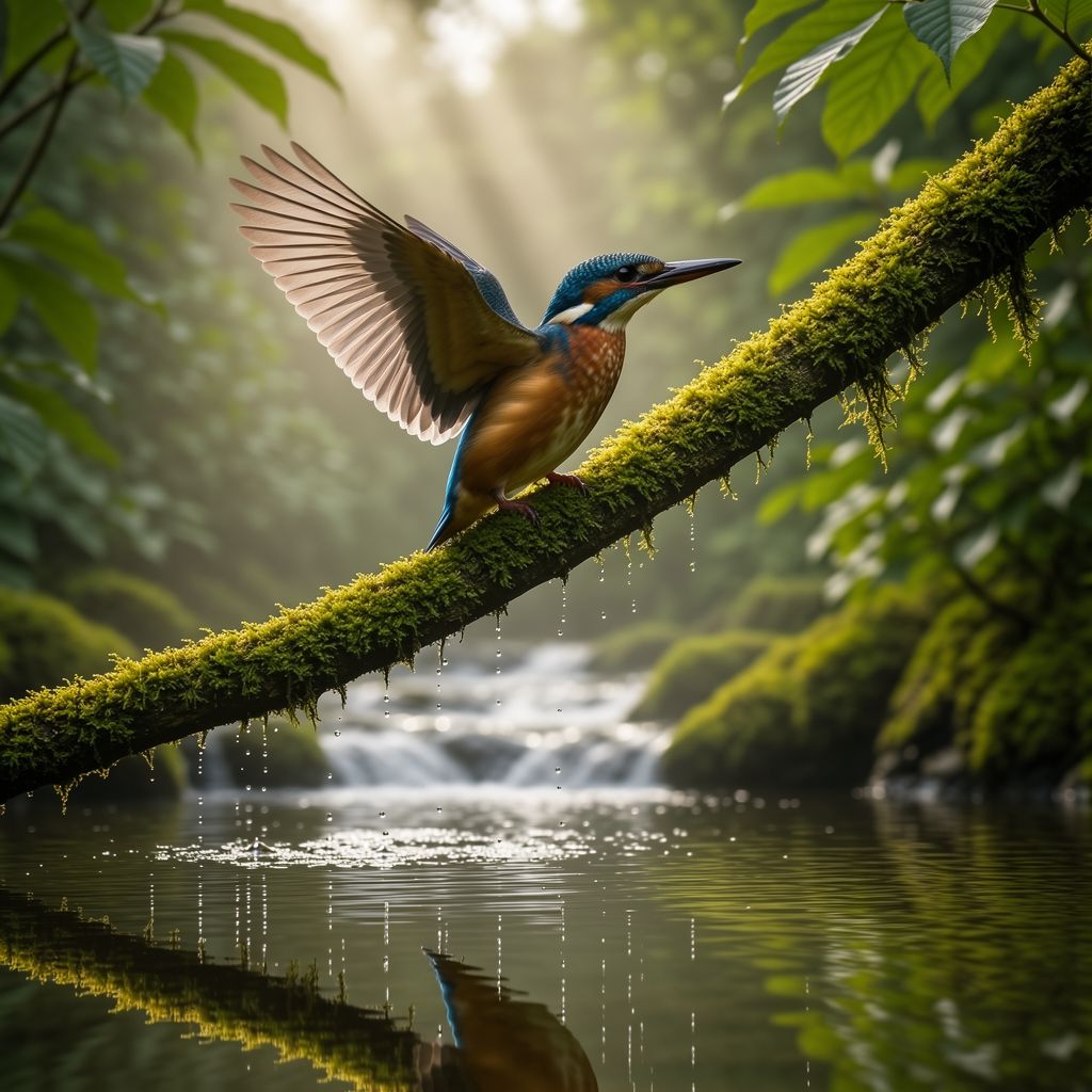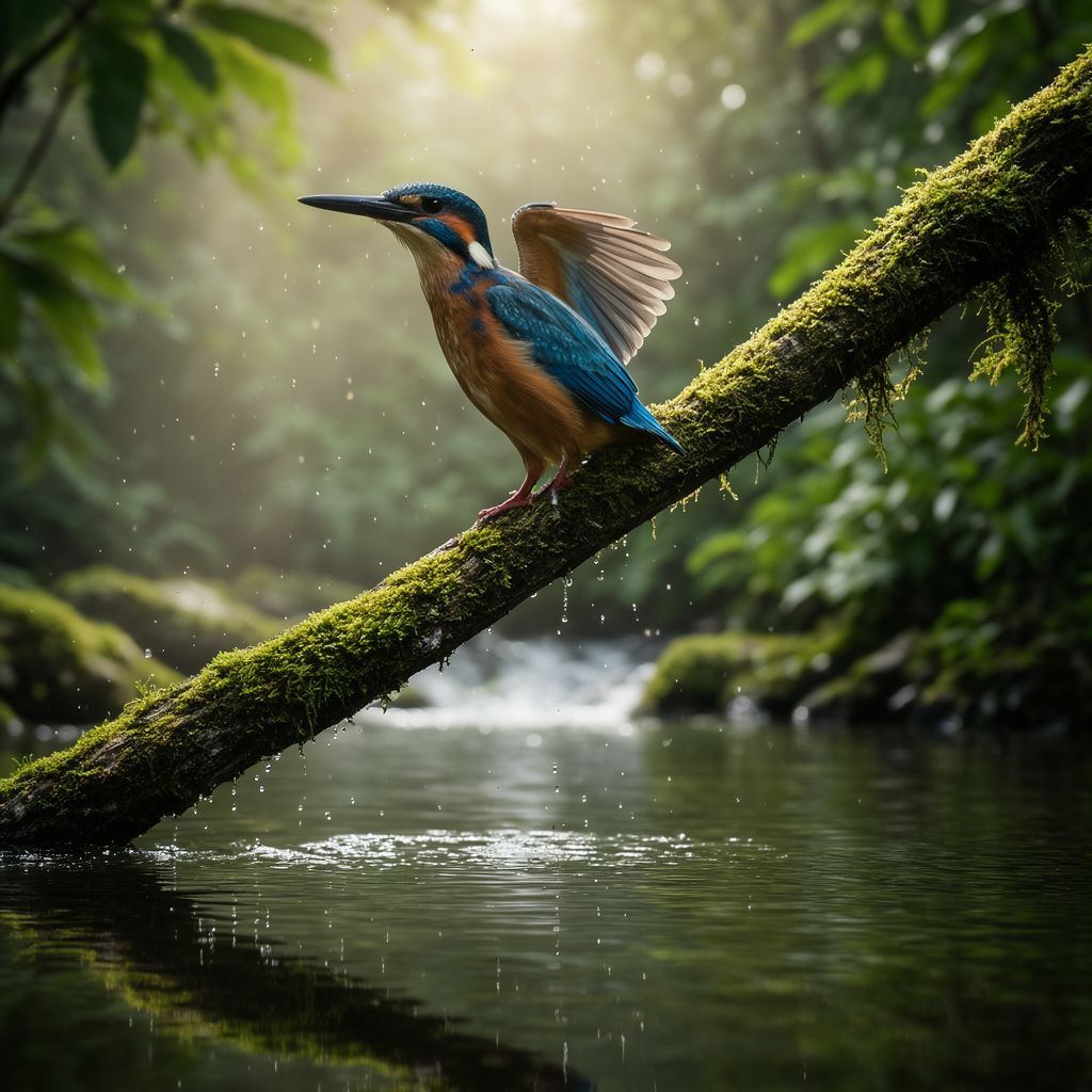 A majestic kingfisher perched on a moss-covered tree branch above a flowing forest stream, wings slightly open, droplets of water frozen in midair, early morning mist, soft volumetric sunlight rays filtering through dense green leaves, clear reflection in the water surface, ultra detailed iridescent feathers with blue and orange tones, macro photography, 200mm telephoto lens, shallow depth of field, professional wildlife photography, high dynamic range.