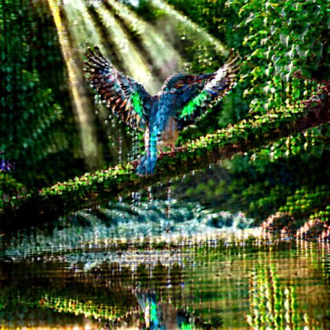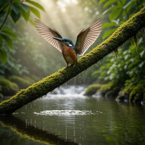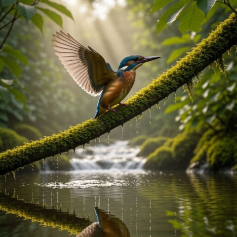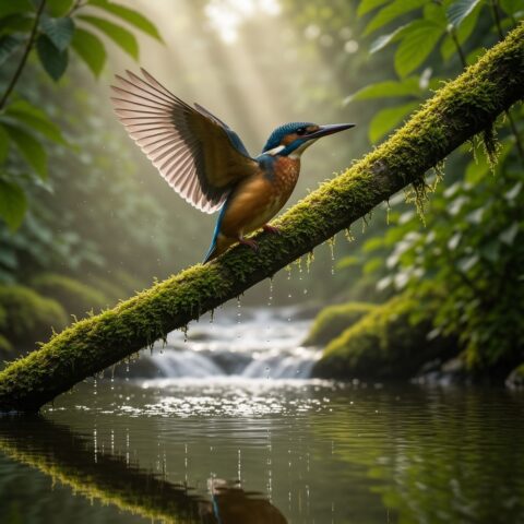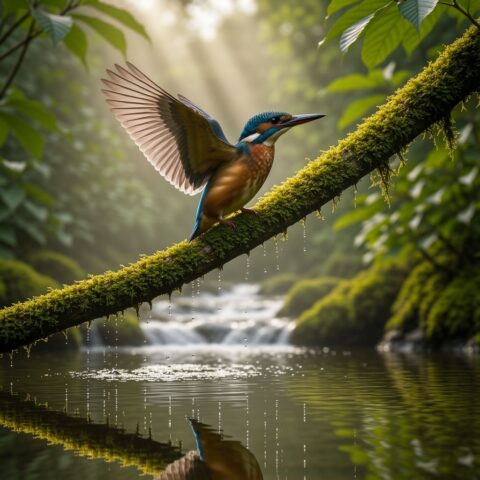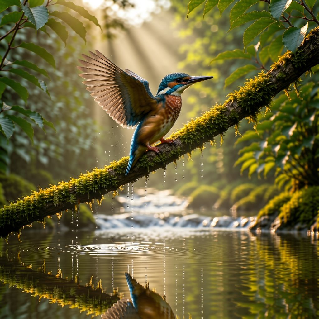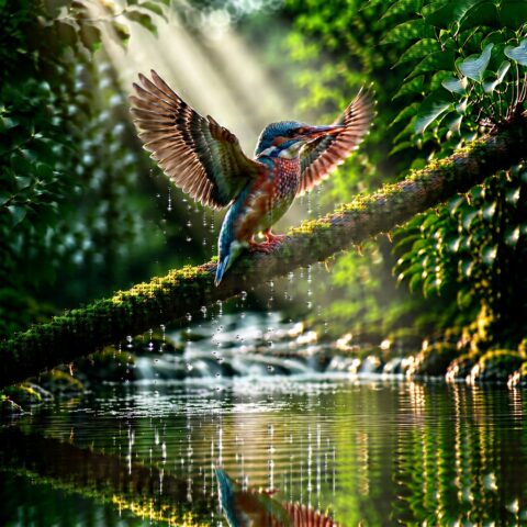 苔むした木の枝にとまる、堂々としたカワセミ。 森の小川が流れるその上で、翼をわずかに広げ、 水滴が空中で静止したかのようにきらめいている。 早朝の霧が立ちこめ、柔らかで立体的な太陽光線が濃い緑の葉の間から差し込んでいる。 水面にはくっきりとした反射が映り、 青とオレンジの色調を帯びた虹色に輝く羽毛が、超高精細に描写されている。 マクロ撮影、200mmの望遠レンズ、浅い被写界深度。 プロフェッショナルな野生動物写真、ハイダイナミックレンジ。