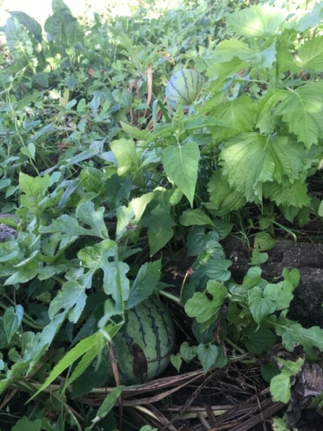 7. 実家の畑で収穫した野菜(ブルーベリー、ミョウガ、きゅうり、ナス、トマト(写真なし)、ミニトマト、オクラ、シシトウ、ピーマン)、8月中旬収穫予定のスイカ(2玉)、雨で溜まった水に落ちていたコガネムシとノコギリクワガタ (2022年7月)
