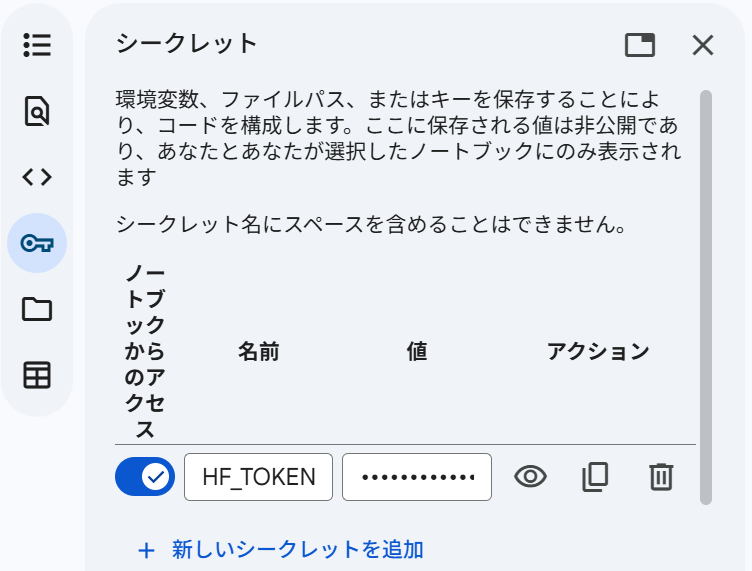 Hugging Face から学習済みモデルを取得できるようにするため、Google Colab の左端の鍵マークをクリックし、下の画像のように HF_TOKEN という名前で Hugging Face の Token をセットしておきます。Hugging Face の Token は、Hugging Face のサイトでアカウントを作成し、無料で作成することができます。